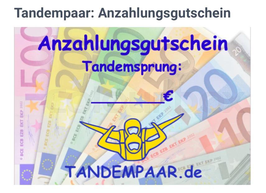 Ein Gutschein für eine Anzahlung zum Tandemspringen hat viele Vorteile! Informiere Dich hier, was es bedeutet, nicht sofort den vollen Betrag für den Tandemsprung zu bezahlen: Dein Vorteil: Du musst nicht direkt den vollen Betrag aufbringen! Der Gutschein zur Anzahlung wird auf den Gesamtpreis angerechnet Der Wertgutschein kann für jede unserer Dienstleistung verwendet werden Auch zur Anzahlung von Fotos oder Video möglich Bestimme selber Dein Budget – egal ob als Geschenk oder Gutschein für Dich selbst (Produkt-ID: 3818499822)