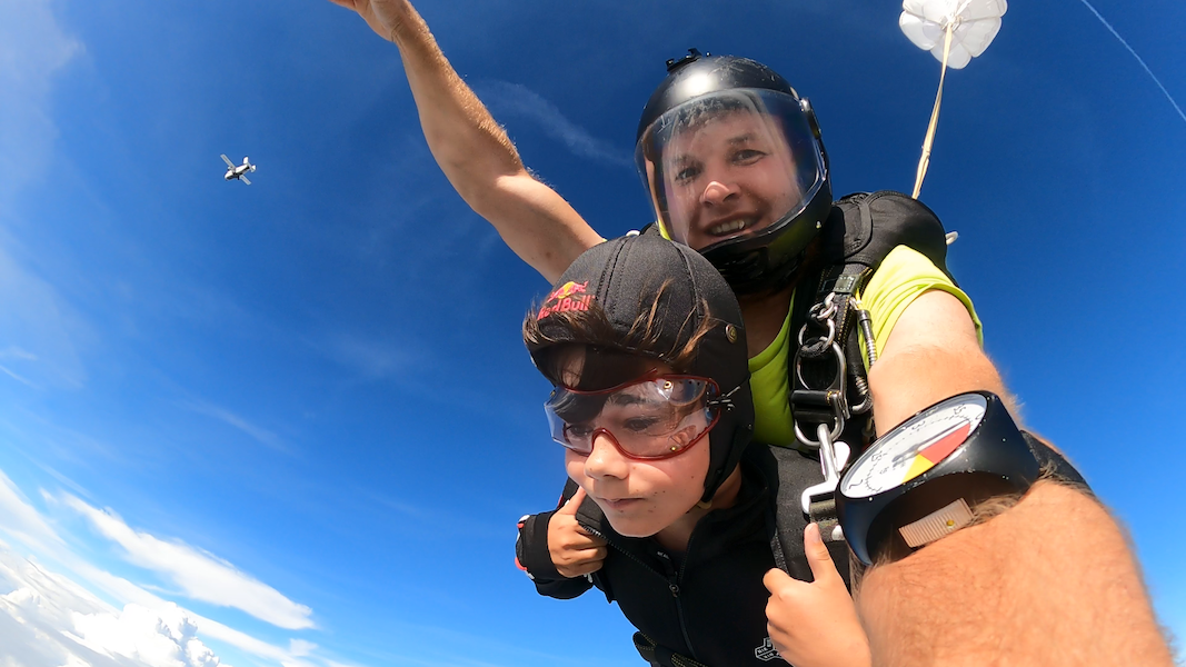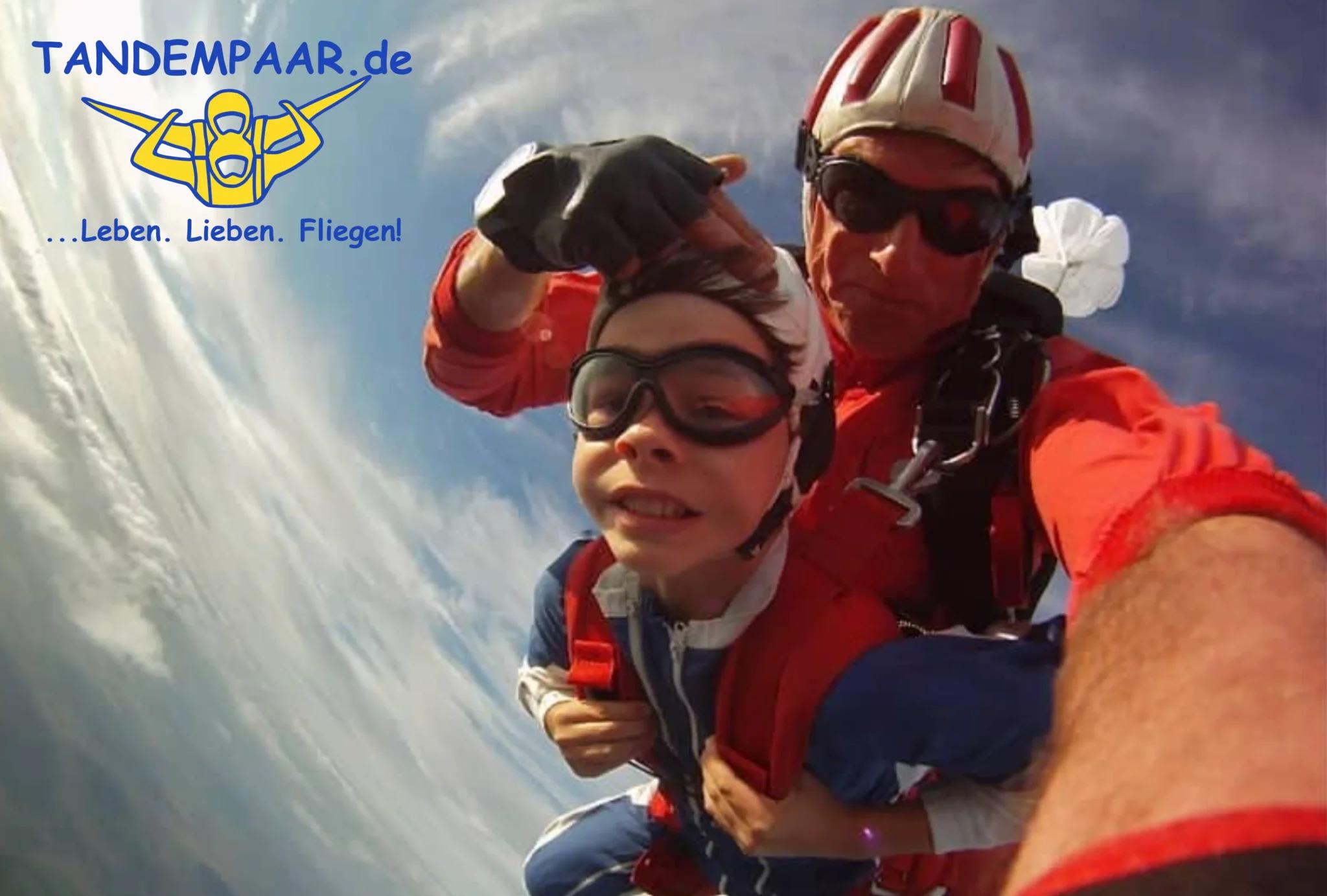 Kinder Fallschirmspringen Tandemsprung: Auch Kinder können Tandemspringen! Denn es ist nicht nur der Wunsch unzähliger Erwachsener, einmal in ihrem Leben aus einem Flugzeug zu springen. Auch viele Kinder möchten sich diesen Traum bereits in jungen Jahren erfüllen. Wir können Dir dabei helfen, denn wir von TandemPaar bieten Fallschirm-Tandemsprünge für Kinder an. Hier findest Du viele Details zum nachlesen zum Thema Tandemsprung für Kinder. Die meisten Eltern stellen sich zuerst die Frage, ab welchem Alter ihr Kind einen Tandem-Fallschirmsprung machen kann. Diese Frage können wir Dir schnell und einfach erklären: denn nicht das Alter ist ausschlaggebend. Bei Kindern ist die Größe entscheidend, ob wir einen Tandemsprung mit Deiner Tochter oder Deinem Sohn machen können. Du glaubst es nicht, doch es ist wahr! Das Alter spielt bei einem Fallschirmsprung als Tandempassagier keine Rolle. Die Körpergröße ist wichtig. Denn erst ab einer Körpergröße von 1,40 m können und dürfen wir mit Deinem Kind einen Tandemsprung durchführen. Das ist so, weil das Passagiergurtzeug erst ab einer Größe von 140 cm zugelassen ist. Nun fragst Du Dich sicherlich, ob Deine Kinder nicht zu jung sind zum Fallschirmspringen? Diese Frage können wir Dir pauschal nicht beantworten. Wir von TandemPaar.de haben auch schon siebenjährige Passagiere gehabt. Und dieses kleine Mädchen war begeistert und wollte sofort nochmal einen Tandem-Fallschirmsprung aus 4300 m machen! Und jetzt Achtung: Dieses Kind war nicht 1,40 m groß! Wie das möglich ist, erklären wir Dir gerne. Denn wir können Deinem Kind bereits ab einer Körpergröße von 120 cm den Traum vom Fallschirm-Tandemspringen erfüllen. Es gibt spezielle Passagiergurtzeuge für Kinder und wir besitzen ein solches. Dieses Kindergurtzeug ermöglicht es uns, mit Deinem Kind ab 1,20 m einen Tandemsprung zu machen. Der Preis ist hierbei der selbe, wie für einen normalen Tandemsprung Gutschein. Voraussetzungen Fallschirm-Tandemsprung für Kinder Eure Kinder können bereits ab 1,20 m einen Fallschirmsprung als Tandempassagier mit uns durchführen. Das Alter zum Tandemspringen ist hierbei nicht entscheidend. Ferner spielen andere Faktoren durchaus eine Rolle, ob Dein Sohn oder Deine Tochter mit uns aus 4300 m Tandemspringen kann: Mindestkörpergröße 120 cm Mindestalter: gibt es nicht. Jedoch empfehlen wir Dir zu warten, bis Dein Kind einen ordentlichen Druckausgleich im Innenohr durchführen kann. Fragt hierzu am besten euren Kinderarzt Der Beförderungsvertrag muss von beiden Eltern unterschrieben werden. Ferner muss mindestens ein Erziehungsberechtigter Elternteil beim Tandemsprung Termin anwesend sein Sehr wichtig: Eure Kinder müssen den Tandemsprung WOLLEN! (Produkt-ID: 3453919851)