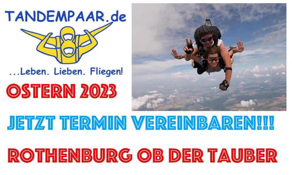 Fallschirmspringen Rothenburg ob der Tauber als Tandempassagier in Bayern. Genauer gesagt im schönen Mittelfranken an der Grenze zu Baden-Württemberg. Hier lassen wir Dich aus allen Wolken fallen, wenn Du als unser Gast zum Tandemspringen an der Kante des Flugzeugs stehst und Dir Dein Herz bis zum Hals schlägt. Denn jeden Moment erwartet Dich eine Minute lang der freie Fall aus 4300 m über Rothenburg ob der Tauber in Mittelfranken. Osterspringen im bayerischen Mittelfranken Jedes Jahr zu Ostern hast Du die Möglichkeit, Dir einen Fallschirmtandemsprung mit den Profis von tandempaar.de zu gönnen. Denn alle Jahre wieder sind wir von Karfreitag bis Ostermontag als euer Tandemsprung Anbieter in Rothenburg ob der Tauber und springen mit euch aus der großen Pink Skyvan. 4000 m – 4300 m Absprunghöhe, eine Minute Freifall, 5 – 8 Minuten Schirmfahrt und Adrenalin bis zum Anschlag erwarten Dich und Deine Freunde jährlich bei uns beim Tandemspringen. Sei dabei und such nicht lang nach Ostereiern, sondern nach dem ultimativen Kick als unser Passagier zum Fallschirm-Tandemspringen. Flugplatz Fallschirmspringen Rothenburg o.d. Tauber in Bayern Unser Sprungplatz zum Tandemspringen im mittelfränkischen Rothenburg im Landkreis Ansbach hat der ganzen Familie etwas zu bieten. Verbringt euer Osterfest bei den Fallschirmspringern und staunt, wenn die große Pink Skyvan abhebt und 15 Minuten später der Himmel mit bunten Fallschirmen geschmückt ist. Die mutigen unter euch können sogar mittendrin und voll dabei sein, nämlich als unser Passagier für einen Tandemsprung. Nach so viel Nervenkitzel könnt ihr im schönen Flugplatzrestaurant den Tag bei eine Oster-Pizza in Ruhe ausklingen lassen. Für Kinder ist ein Spielplatz direkt am Restaurant, Parkplätze sind ausreichend vorhanden und Action bieten euch die Skydiver, die ununterbrochen aus dem Flugzeug springen. Ablauf Tandemsprung Rothenburg in Bayern Das Team von tandempaar.de erwartet euch mit mindestens drei Tandempiloten. Somit könnt ihr auch in kleinen Gruppen einen Tandemsprung in Rothenburg ob der Tauber machen. Eine gründliche Einweisung am Boden erhält jeder Passagier direkt vor Ort. Sprungoveralls, Brille und Mütze wird ebenfalls von uns gestellt. Ihr als unsere Gäste zum Fallschirm-Tandemspringen braucht lediglich sportliche Freizeitkleidung, ein bisschen Mut und ganz viel gute Laune. Genießt den Steigflug und vertraut eurem Tandemmaster, wenn er euch rechtzeitig fest bei sich einhakt. Auf 4300 m steht ihr nun an der Heckrampe und springt hinaus in den freien Fall. Nach 60 Sekunden purem Adrenalin öffnet sich sanft der Fallschirm und ihr könnt das schöne Frankenland aus einer neuen Perspektive betrachten. Nach 5 – 8 Minuten Schirmfahrt landet ihr am Sprungplatz und könnt euch von eurem Fanclub gebührend feiern lassen. Gutschein und Anfahrt Sprungplatz Rothenburg / Mittelfranken Der Flugplatz Rothenburg ob der Tauber hat eine sehr gute Verkehrsanbindung und ist über die Autobahn von Nürnberg, Heilbronn und / oder Würzburg aus gut zu erreichen. Es sind außerdem mehr als genügend Parkplätze für unsere Gäste vorhanden, die sich bei uns zum Tandem-Fallschirmspringen angemeldet haben. Im angrenzenden Flugplatzrestaurant könnt ihr eventuelle Wartezeiten überbrücken und derweilen den Fallschirmspringern zuschauen, wie sie ihre Schirme packen. Jedes Jahr zu Ostern sind wir für euch zum Tandemspringen in Rothenburg. Tickets sind drei Jahre gültig und können auf allen unseren Sprungplätzen eingelöst werden. Ebenso super: Als Geschenk eignet sich ein Fallschirm-Tandemsprung hervorragend und kann als Gutschein bei uns gekauft werden. Die beschenkte Person setzt sich nach Erhalt des Ticket-Gutscheins einfach mit uns in Verbindung und vereinbart einen Termin. Tandemsprung Ticket Rothenburg als Geschenk zu Ostern Wir freuen uns, Dich und Deine mutigen Freunde als unsere Passagiere zum Tandemspringen als Fallschirmsprung-Gast bei uns in Rothenburg ob der Tauber begrüßen zu dürfen. Trau Dich und sei dabei, wenn wir Dich jährlich an Ostern aus allen Wolken fallen lassen. Bevor Du Deinen Gutschein kaufst, erkundige Dich noch über unsere Foto- und Video-Möglichkeiten! Wir bieten Dir 4 verschieden Optionen zu Auswahl. Dadurch hast Du Dein Abenteuer Fallschirmspringen für immer als Erinnerung. (Produkt-ID: 3453920357)