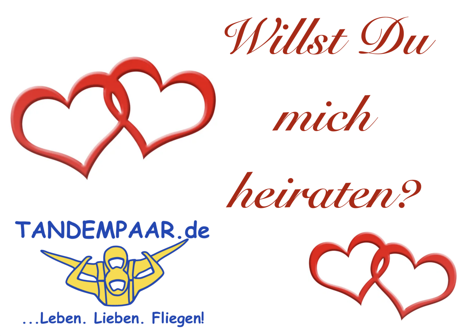Heiratsantrag beim Tandemsprung: Du schwebst schon lange mit Deinem/r Partner/in im siebten Himmel und bist bereit für den großen Schritt? Dann mach diesen Schritt zwischen Himmel und Erde aus einem Flugzeug hinaus und stelle Deiner/m Angebeteten die Frage aller Fragen bei einem Fallschirm-Tandemsprung! Denn außergewöhnlicher kann ein Hochzeitsantrag nicht sein. Nur wir von TandemPaar bieten Dir eine Verlobung der Extraklasse beim Tandemspringen aus 4300 m. Romantische Verlobung beim Fallschirmspringen Heiratsantrag mit Herzklopfen: Nichtsahnend steht Dein Schatz an der Rampe des Flugzeugs und ist bereit, einen Fallschirmsprung als Tandempassagier zu meistern. Genauso wie Du – nur Du springst mit Deinem erfahrenen Tandemmaster als Erster und erwartest Deinen Liebling unten am Boden. Vor einem großen Banner mit dem Schriftzug „Willst Du mich heiraten?“ klopft Dir Dein Herz bis zum Hals, weil Du jeden Moment die große Frage persönlich stellen wirst, sobald Dein/e Zukünftige/r sicher neben Dir gelandet ist. Doch nicht nur Du wirst Herzrasen haben: Denn unser ausgelegtes Banner ist bereits aus der Luft lesbar und somit wird Dein Schatz bereits bei der Schirmfahrt erahnen können, was unten für eine Überraschung wartet. Exklusives "Ja, ich will" Heiratsantrag-Paket: Das steckt drin 2 Tandemfallschirmsprünge aus 4300 m 2 Multimedia Pakete „Gold“ mit Fotos und Videos Ein exklusiv für euch geschnittenes und zusammengefasstes Video eurer Fallschirmsprünge mit 10 – 15 privaten Bildern von euch 1x als Standard mit Gemafreier Musik 1x ohne Ton (um eure Lieblingssongs selber einzufügen) 1x alle Rohdaten Ein am Boden ausgelegtes Riesen-Banner (von TandemPaar leihweise zur Verfügung gestellt) mit „Willst Du mich heiraten?“ Schriftzug, das Dein Liebling aus der Luft bei der Schirmfahrt lesen kann Und ein romantisch arrangierter Tisch mit Rosen, einer Flasche gekühltem, personalisierten Sekt und zwei Überraschungsgeschenken von TandemPaar Alles so geplant, dass Du vor Deinem/r Partner/in landest und Deinen Antrag machen kannst. Den Ring verwahren wir für Dich derweilen sicher bei uns am Boden Und das alles für nur 950 € insgesamt! So einen außergewöhnlich Heiratsantrag gibt es nur bei TandemPaar. Und während ihr im Steigflug seid, um euren Fallschirmsprung als Tandempassagiere zu machen, kümmert sich unser Bodenpersonal um die Vorbereitungen am Boden. So arrangiert, dass auch alles bis zur großen Frage geheim und inkognito bleibt. Die perfekte Überraschung für Deinen Schatz für nur 950 €. (Produkt-ID: 3453919859)