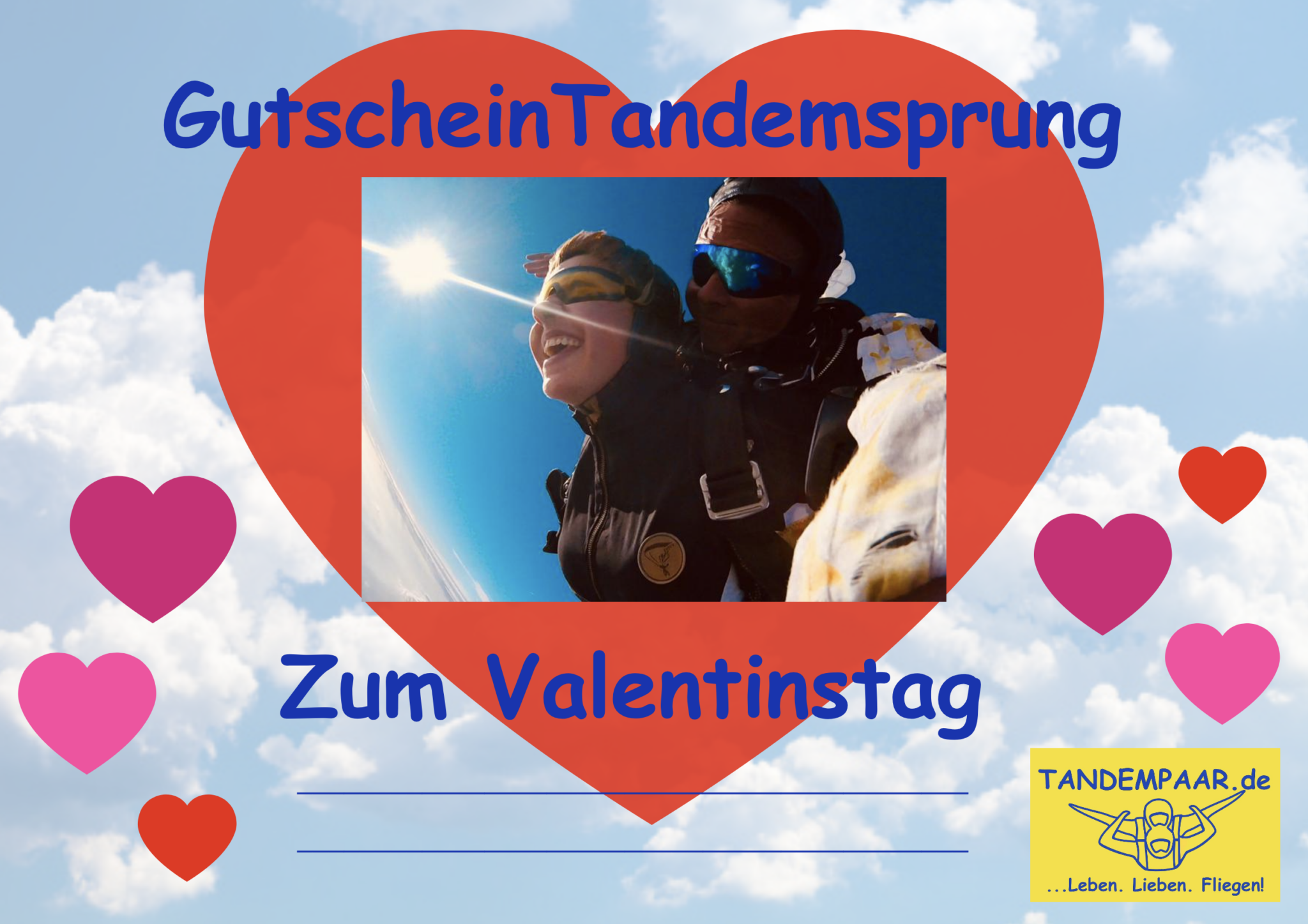 Fallschirmspringen als Valentinstagsgeschenk. Zeit zu zweit ist das schönste Geschenk, das Du Deinem Partner machen kannst. Warum dann nicht einen Gutschein zum Fallschirmspringen als Tandemsprung verschenken? Blumen und Pralinen waren gestern. Wenn Du Deinem Schatz ein atemberaubendes Geschenk zum großen Tag der Liebe machen willst, dann hol Dir einen Geschenk Gutschein zum Tandemspringen. Denn was könnte euch noch enger zusammenschweißen, als der Sprung aus über 4000 Meter aus einem Flugzeug? Fliegt gemeinsam in den 7. Himmel zum Valentinstag! (Produkt-ID: 4436211495)