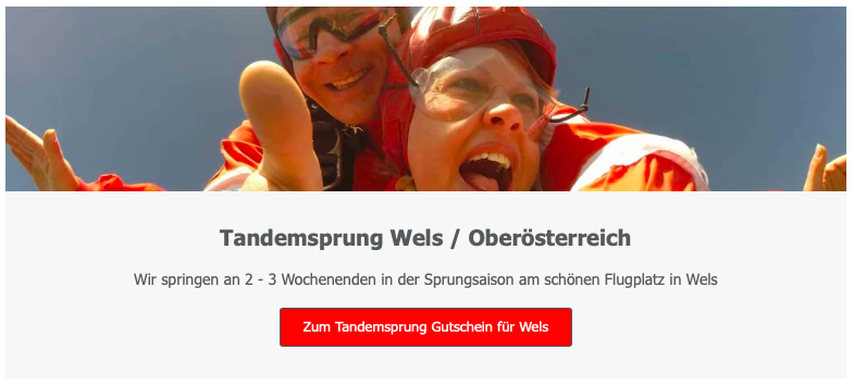 Tandemsprung Wels Oberösterreich: Geschenkideen gibt es unzählige. Aber das einzig wahre Geschenk ist und bleibt ein Gutschein für einen Tandem-Fallschirmsprung. Wir von Tandempaar bieten Dir so viele verschiedene Sprungplätze für Deinen Tandemsprung aus 4300 m, wie sonst kein anderer Anbieter. Komm zu einem unserer vielen Termine in Wels an der Grenze zu Oberösterreich und erlebe die Vorteile, die sich Dir und Deinen Freunden dort bieten. Fallschirmsprung am Flugplatz Wels Nahe der bayerischen Grenze Die Stadt Wels liegt in Oberösterreich und ist Nahe an der Grenze zu Niederbayern. Die sehr gute Infrastruktur lässt selbst weite Anreisen schnell vergehen, da Wels in Österreich perfekt an die Autobahnnetze angebunden ist. Von der bayerischen Seite aus erreichst Du Wels von Regensburg in der Oberpfalz in nicht einmal 2 Stunden über die A3 und die A8. Gäste aus dem Raum Deggendorf und Passau sind demnach sogar noch schneller bei uns. Selbst aus dem Großraum München kann man in guten 2 Stunden den Sprungplatz Wels über die A94 erreichen. Die meisten Anbieter für Fallschirm-Tandemsprünge springen mit euch aus einer kleinen Cessna 182 und gerade einmal 3000 Metern Absprunghöhe. Nicht so in Wels – hier fliegen wir mit Dir auf 4300 m und springen aus einer großen Cessna Caravan, die bis zu 18 Skydivern Platz bietet. Aus dieser Absprunghöhe hast Du unglaubliche 60 Sekunden, also eine Minute freien Fall! Vor Deinem „Tandemsprung Wels“ bekommst Du natürlich eine ausführliche Einweisung in den gesamten Ablauf und wir üben mit Dir die notwendigen Körperhaltungen, die Du zum Absprung, dem Freifall und der Landung einnehmen musst. Bei uns von Tandempaar bist Du in sicheren und professionellen Händen. Wir passen nicht nur sehr gut auf Dich auf, wir bereiten Dir auch noch die großartigsten sechzig Sekunden Deines Lebens 😉 Schirmfahrt mit Panorama-Kulisse in Wels bei Passau Nach dem Steigflug in der Cessna Caravan auf 4300 Meter beginnt Dein Tandem-Actionprogramm mit dem Absprung. Hier sitzt Du fest verbunden mit Deinem Tandemmaster in der Seitentür des Flugzeugs und nimmst Deine Absprunghaltung ein, bevor sich Dein Tandempilot mit Dir in die Tiefe stürzt. Nach einer Minute Freifall wird der Fallschirm auf 1500 m Höhe geöffnet und Du kannst, natürlich noch im Adrenalinrausch, die ruhige Schirmfahrt genießen. Diese dauert ca. 5-8 Minuten. Am offenen Fallschirm fährt Dich Dein Tandemmaster sicher zum Flugplatz zurück, während Du die atemberaubende Kulisse bewundern kannst. Sieh Dir Wels aus der Vogelperspektive an und staune, wenn sich im Süden die Alpen Österreichs vor Dir erstrecken. Ein wunderschöner Anblick, den Du so lange genießen solltest, bis Du Dich auf Deine Landehaltung vorbereiten und konzentrieren musst. Tandemsprung Wels: Geschenkgutschein Fallschirm-Tandemspringen als Überraschung Selbstverständlich kannst Du auch für unseren Sprungplatz in Wels in Oberösterreich einen Gutschein kaufen und verschenken. Ein wunderbarer Tagesausflug ins schöne österreichische Wels, gekrönt mit der Überraschung schlechthin – einem Geschenkgutschein für einen Tandemsprung mit Tandempaar. Bereite einem lieben Menschen die Freude seines Lebens und lass uns mit ihm aus 4300 Metern aus einem Flugzeug springen! Und Du kannst auch im gleichen Flieger sitzen und mit uns aus allen Wolken fallen, wenn Du möchtest. Hierzu brauchst Du auch keinen weiteren Gutschein mehr kaufen. Schreibe uns einfach eine Email oder eine WhatsApp und wir planen Dich am selben Tag und auch noch in der selben Runde gerne mit ein. Nach eurem Adrenalinkick könnt ihr euch im hervorragendem Flugplatzrestaurant ein kühles Bierchen und österreichische Schmankerln schmecken lassen. Genießt noch eine Weile den sagenhaften Flair der Fallschirmspringer und schaut uns zu, wie wir immer wieder einsteigen und mit unseren bunten Schirmen den Himmel schmücken. Der Flugplatz Wels in Oberösterreich Nahe Passau ist ein hervorragender Ort, um liebe Menschen mit dem ultimativen Geschenk zu überraschen. Sichere Dir jetzt schon das nächste Weihnachtsgeschenk und hol Dir einen Gutschein zum Tandem-Fallschirmspringen mit Tandempaar im oberösterreichischen Wels. (Produkt-ID: 3453920358)